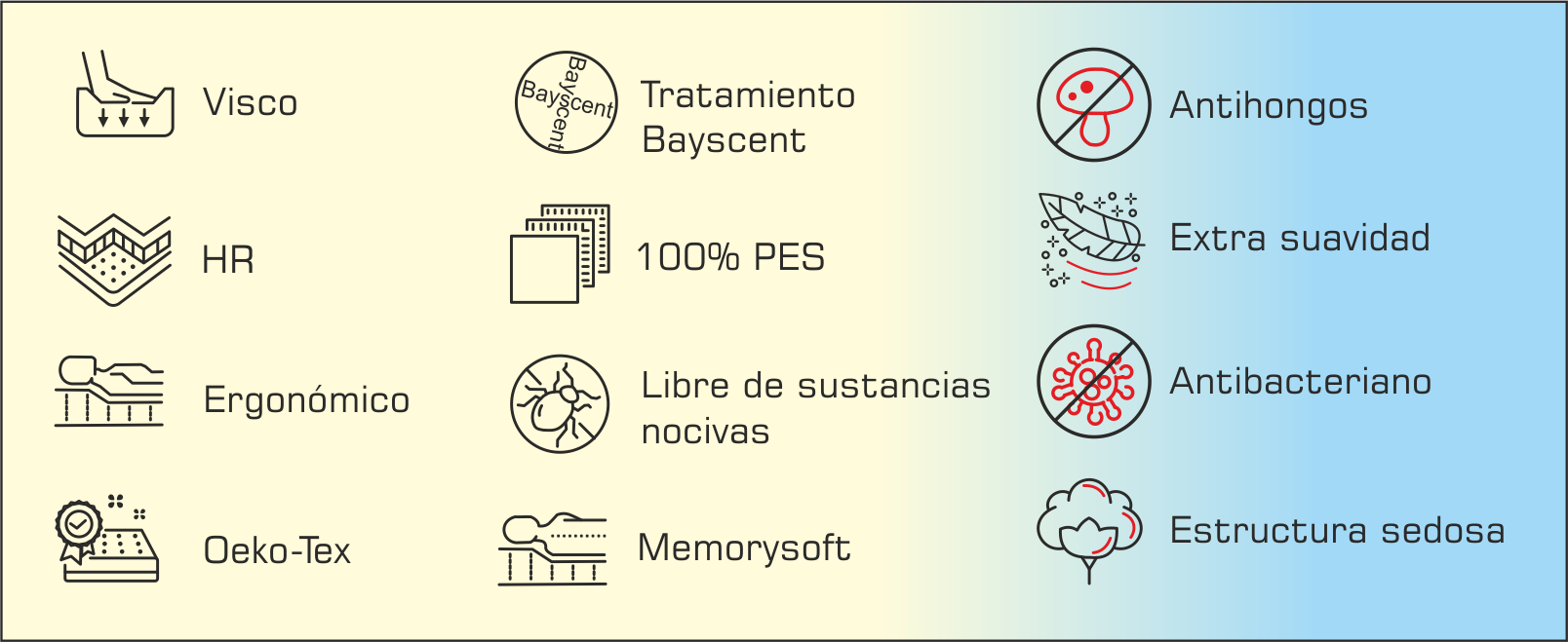 Medidas | 80×180, 80×190, 80×200, 90×180, 90×190, 90×200, 105×180, 105×190, 105×200, 120×180, 120×190, 120×200, 135×180, 135×190, 135×200, 140×190, 140×200, 150×190, 150×200 |